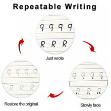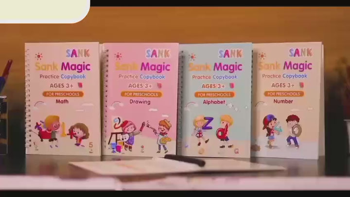 Complete Learning Set: 4 reusable copybooks (Alphabet, Numbers, Drawing, Math) + 10 magic ink refills + 1 pen with grip.